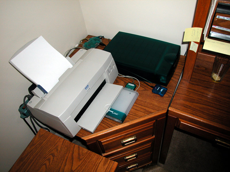Heres my Epson Stylus Color 900 printer, Agfa SnapScan 1212u Scanner, Imation SuperDisk drive and the Transcend Compact Flash card reader, all are connected to the Macalley 7 Port USB Hub behind the scanner. My digital Hub things.