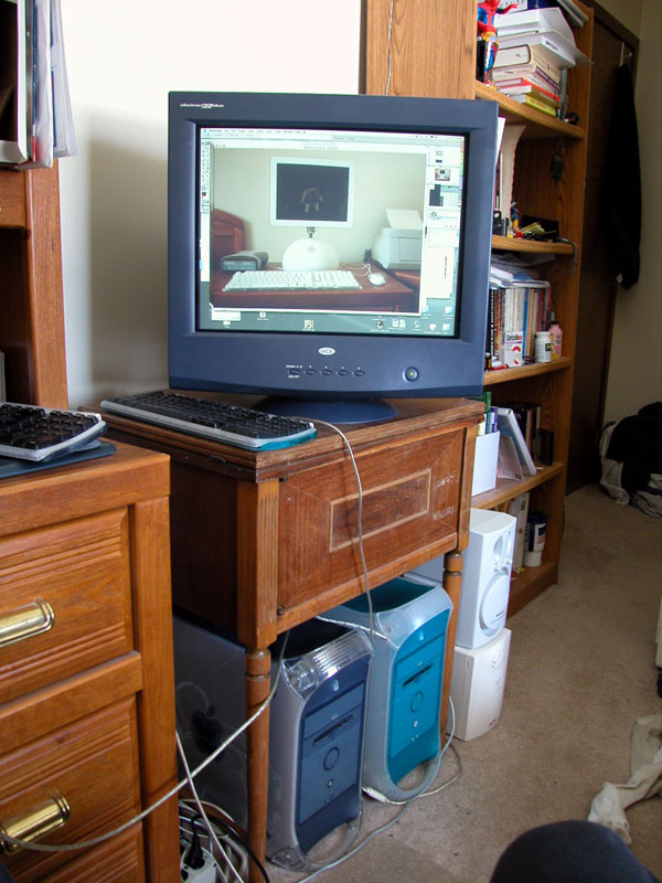 Playing with Pictures on the G4 400. The Lacie Electron22blue II is a great big hunk of display. Has great color and i like it. It seems the models keep advancing every year in Roman numerals. Last I checked they were up to the IV. This one has 2 VGA iputs so i can use the G3 and G4 on it with the push of one toggle button on the front.